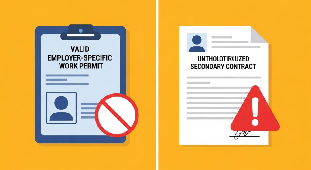 The vast majority of work permits issued under the TFWP are employer-specific (closed) permits. A pervasive and severe compliance error is a foreign national accepting secondary employment, or transferring to a different branch, subsidiary, or franchise of the same company without prior IRCC authorization. Working for any employer other than the one explicitly named on the work permit, or working in a different geographic location or NOC code than specified, constitutes unauthorized employment. This violation renders the worker out of status, subject to immediate deportation, and structurally compromises any future permanent residency applications under the Canadian Experience Class (CEC).